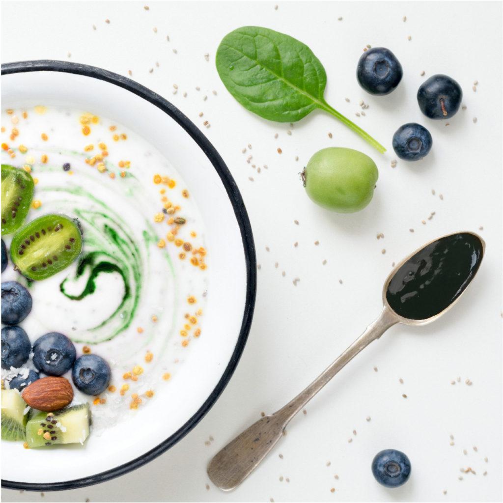 ส่วนผสมนม 1 ลิตรโยเกิร์ต 1 ช้อนชาผลไม้ที่ชอบสาหร่ายสไปรูลิน่า 25 กรัม